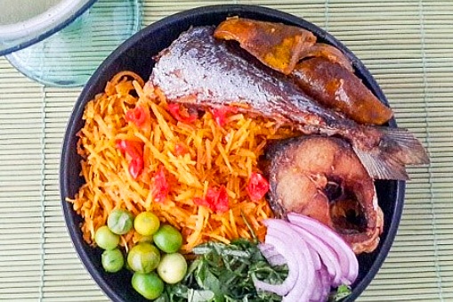 For the garnishes: Cut, wash, season fish with salt and fry till browned. Wash and shred anala leaves, wash and remove stalks from garden eggs, Slice the onions.