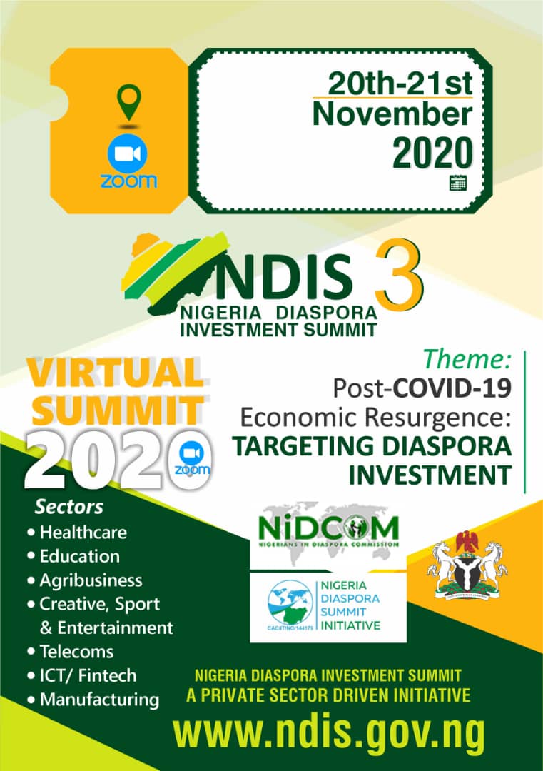 The 3rd Nigeria Diaspora Investment Summit held virtually on the 20th and 21st of November 2020. This annual event is convened by Nigeria Diaspora Summit Initiative (NDSI) in collaboration with Nigerians in Diaspora Commission. Theme was: Post-Covid -19 Economic Resurgence: TARGETING DIASPORA INVESTMENT.